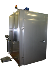 Oblewarka to urządzenie służące do wybarwiania, nabłyszczania i naolejania wędlin, poprzez oblanie wsadu wózka preparatem dymowym lub koloryzującym. W komorze zastosowano innowacyjny układ natrysku oraz tacę zbierającą.
